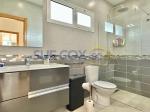 Inside, the property opens into a bright living-dining room with air conditioning and sliding patio doors with shutters that lead out to the terrace. The ground floor also offers a shower room, under-stairs storage, and a rear-facing double bedroom with sliding windows and shutters. The fully fitted kitchen features granite work surfaces and integrated appliances, including a dishwasher, with direct access to the communal area and swimming pool. There is a covered utility area where you will find the water heater and storage cupboards housing the washing machine and tumble dryer. This area also provides extra storage space that could be used for bicycles or other items.